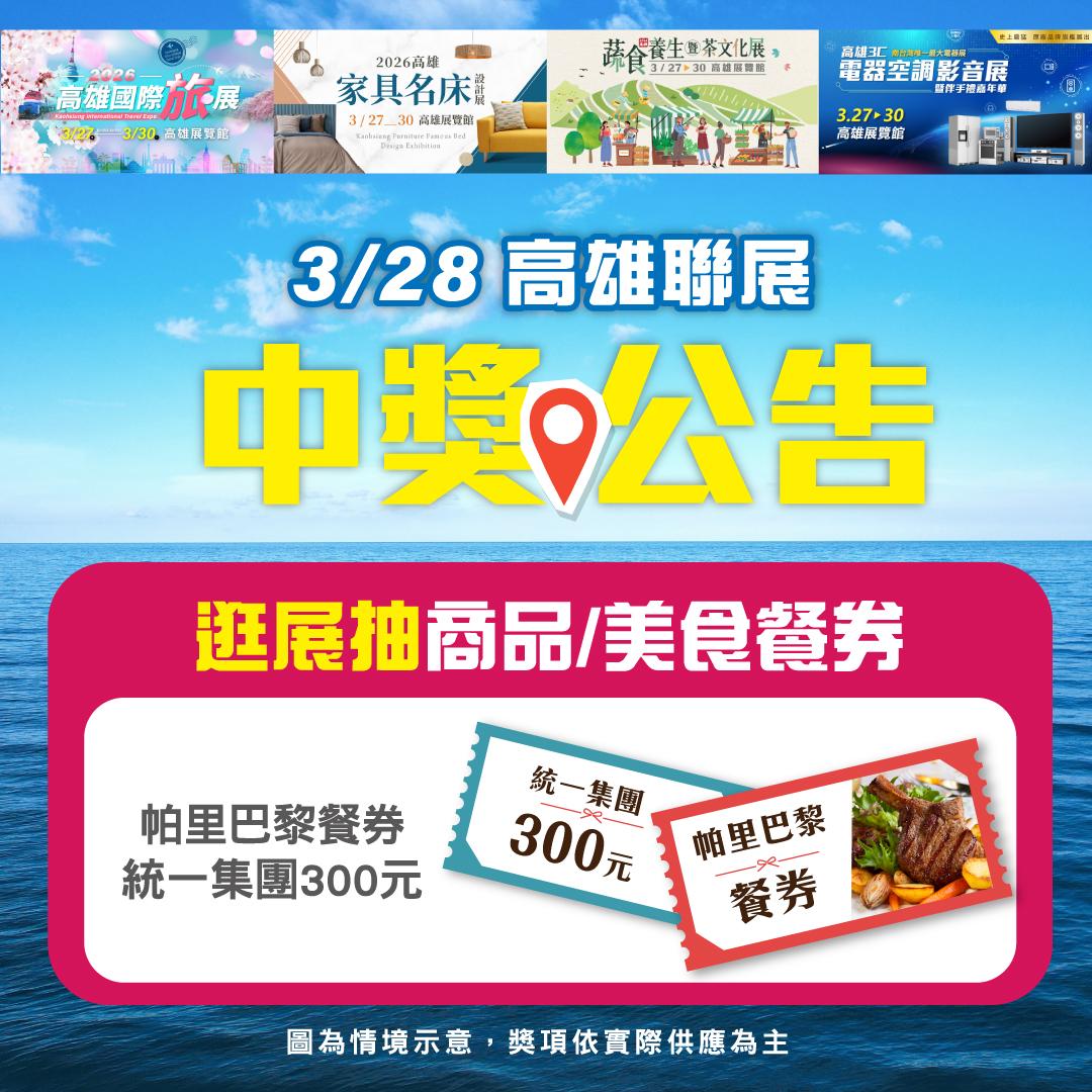 高雄旅展天天抽【帕里巴黎餐券/統一300禮券】-3/28中獎名單
